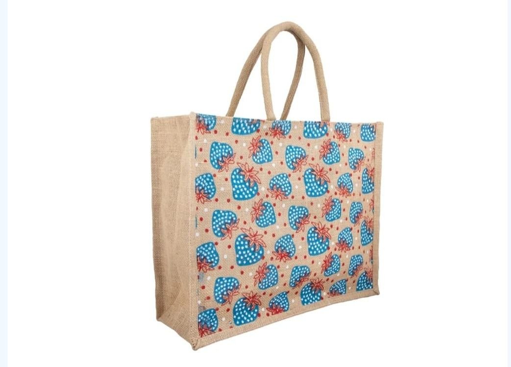This eco-friendly jute bag features a charming blue heart and floral print design, adding a touch of elegance to your daily carry. Crafted from 100% natural jute, it is strong, reusable, and perfect for shopping, gifting, or everyday use.